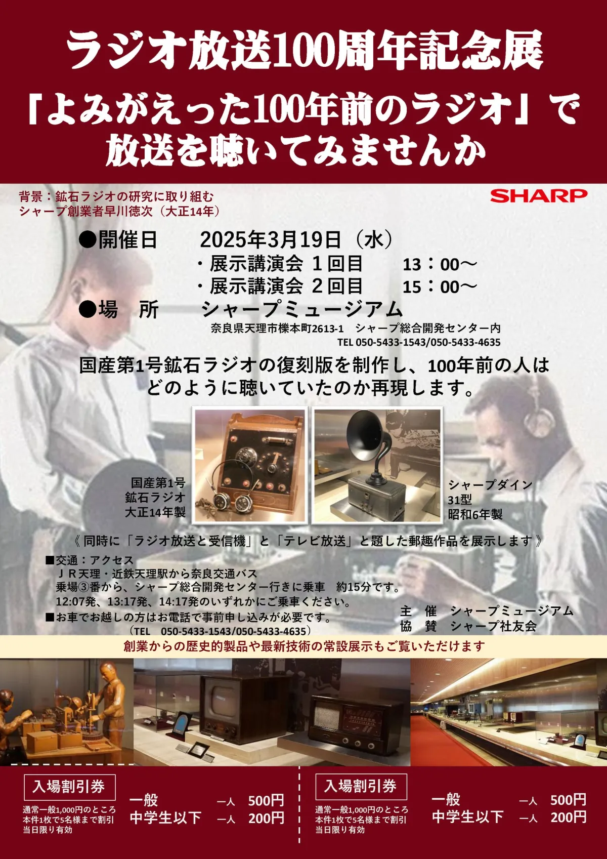 特別展の日時は、2025年3月19日(水)の13:00から16:30までです。鉱石ラジオや真空管ラジオの実演と解説は、13:00と15:00に予定されています。会場はシャープ総合開発センター内のシャープミュージアムです。