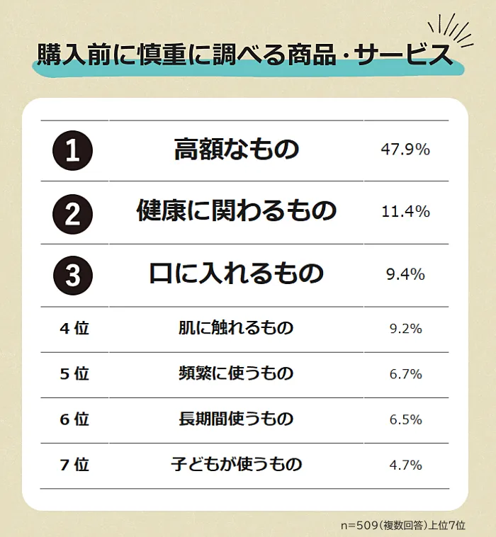 調査の結果、購入前に特に慎重になっている商品は以下のようになっています。