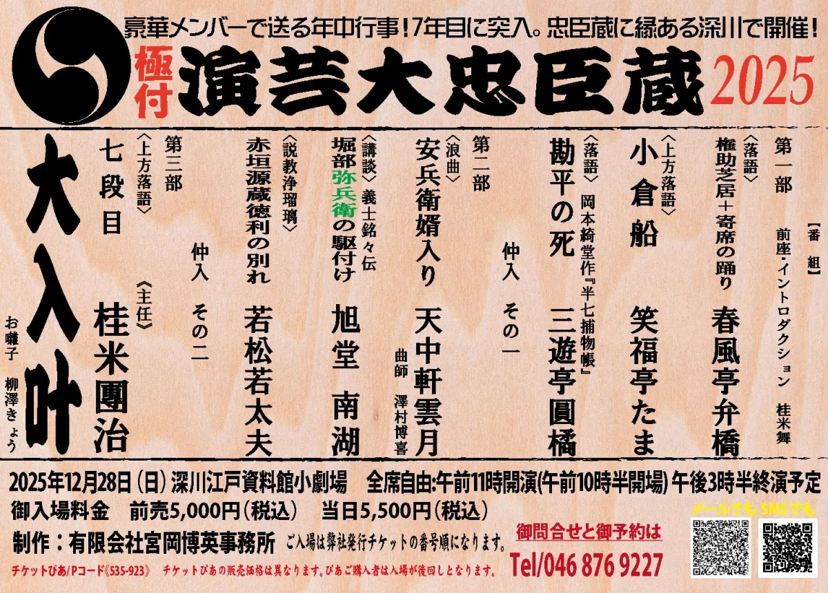 毎年恒例となっています『演芸大忠臣蔵2025』が、2025年12月28日に神奈川県横須賀市の深川江戸資料館小劇場で開催されます。このイベントは、有限会社宮岡博英事務所がプロデュースし、年末の風物詩として多くの人々に愛され続けています。