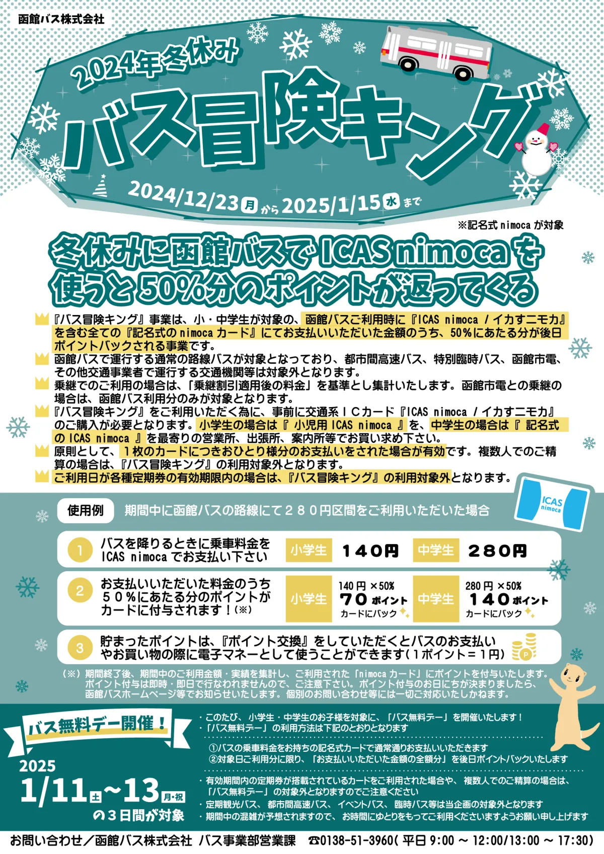 小中学生の皆さん、2024年冬休みがやってきます!この期間、函館バスが実施する「バス冒険キング」に参加して、バスの旅を楽しみつつお得な特典をゲットしませんか?