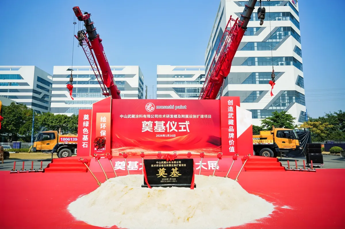 2026年1月16日、武蔵塗料グループは中国広東省中山市にある中山武蔵塗料有限公司にて、第二工場の新棟起工式を行いました。この新たな取り組みは、開発棟の新設とともに、既存工場のスマート化を見据えた改築を進めるという壮大なプロジェクトの一環です。
