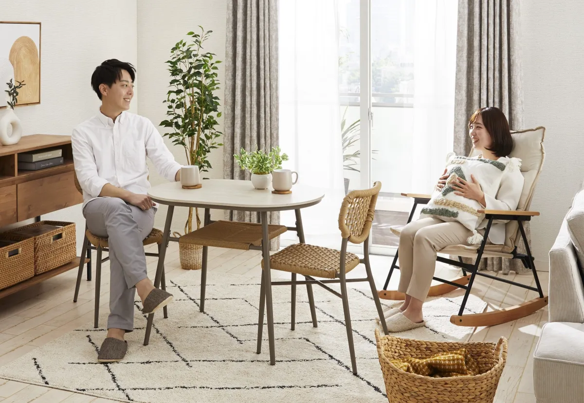「ウチソトダイニング」の最大の特徴は、コンパクトでありながら実用性を兼ね備えている点です。スチールフレームを使用したテーブルとチェアは、軽量で持ち運びが容易なため、晴れた日にはバルコニーや庭に出して食事を楽しむことができます。お食事後は室内に戻してもスペースを取らず、その日の気分に合わせて自由に動かせるのが魅力です。
