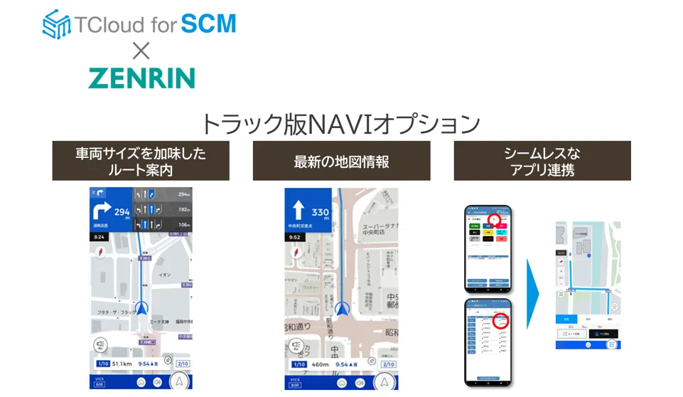 今後は「TCloud for SCM」のオプションとしてゼンリンのロジスティクスサービスを利用できるようになり、以下の機能が特に強調されます: