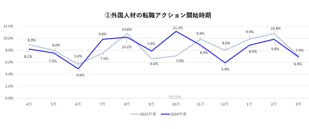 中途層の外国人材に関する調査結果からは、転職活動が主に7月から10月に集中していることが判明しました。2024年度は、2023年度に比べて活動開始が早まる傾向があり、特に10月には実に11.1%の成約者が活動を開始しました。