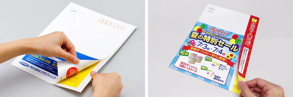 「フチのり圧着DM」は、紙の端に糊を塗布して接着する仕様が特徴です。これにより、通常のUV圧着DMと比べて製造コストを削減し、さらに薄くて軽い仕上がりを実現。通常のはがきサイズよりも広い印刷面を持っているため、デザインおよびレイアウトの幅も広がります。また、圧着を開ける楽しみがあるため、開封率が向上するという利点もあるのです。特に、広告を用いたマーケティング戦略においては、開封率の向上は非常に重要です。