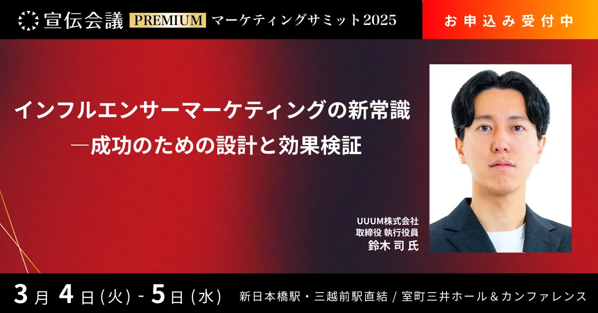 2025年3月4日と5日、東京都内にて「宣伝会議マーケティングサミットPREMIUM 2025」が開催されます。このイベントに、クリエイティブエージェンシーUUUM株式会社が登壇することが決まりました。UUUMは、インフルエンサーマーケティングを新たな視点から捉え、その重要性を広めるためのセッションを行います。
