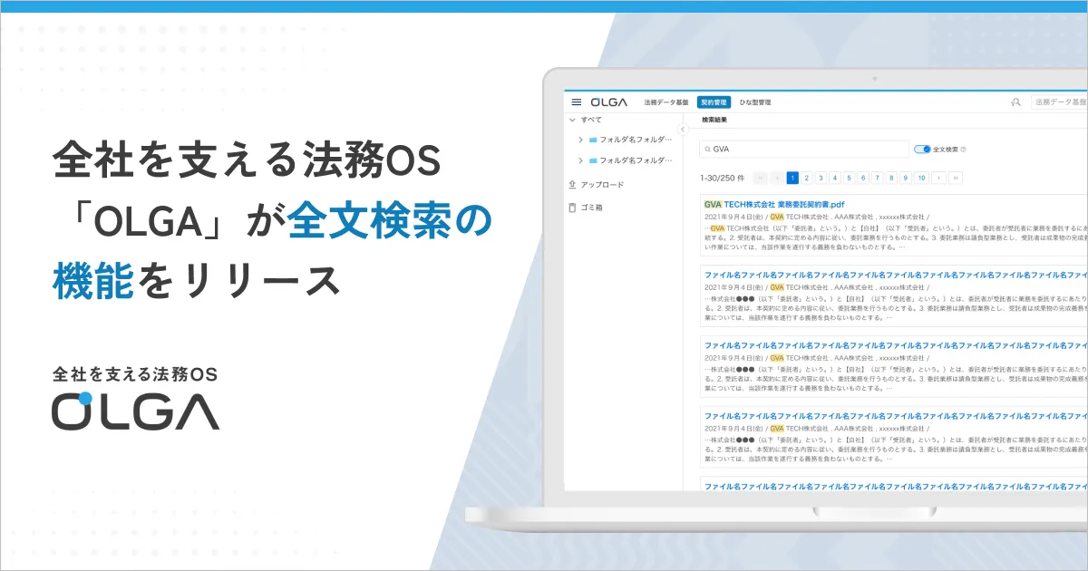 GVA TECH株式会社は、東京都渋谷区に本社を置くリーガルテック企業で、法務部門と事業部門の業務効率化を目指す統合型プロダクト「OLGA」を展開しています。最近、同社は「OLGA」に新機能として全文検索機能を追加したことを発表しました。この機能は契約書や関連文書に含まれるテキストを横断的に検索できるもので、法務業務のさらなる効率化を図ります。
