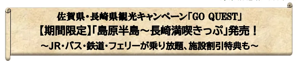 この「GO QUEST」キャンペーンと「島原半島~長崎満喫きっぷ」を利用して、九州の自然や文化、歴史を存分に楽しみましょう。長崎の美しい景色や豊かな食文化、そして温かい人々と出会うことができる素晴らしい機会です。期間限定での提供ですので、このチャンスをお見逃しなく!