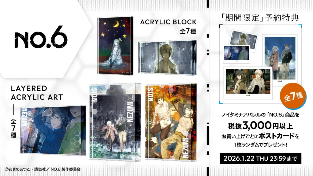 TVアニメ「NO.6」の放送当時に使用された、toi8先生の描き下ろしイラストが商品化され、斬新なレイヤードアクリルアートとアクリルブロックとなって登場します。これらの新商品は、2026年1月8日(木)より販売が開始されるため、ファンの方々の期待が高まっています。