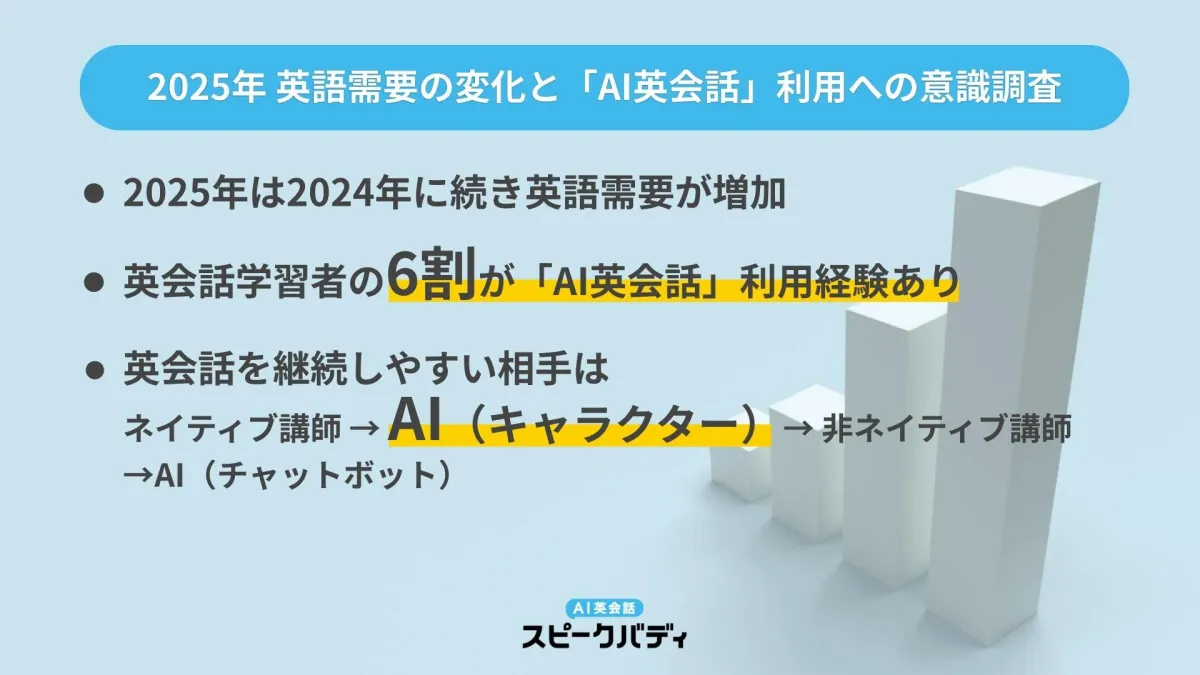 株式会社スピークバディが行った最新の調査によると、2025年も前年に引き続き、英語の需要が著しく伸びていることが明らかになりました。この調査は、日本国内の英会話学習経験者や学習意向者を対象に実施され、具体的なデータと傾向が収集されました。
