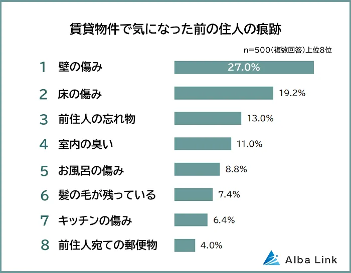 株式会社AlbaLinkが運営する空き家買取隊は、賃貸物件に住んだ経験のある500人を対象に、「前の住人の痕跡」に関する意識調査を実施しました。この調査から、賃貸物件における前住人の痕跡がどのように認識されているのか、またその対処法について考察します。