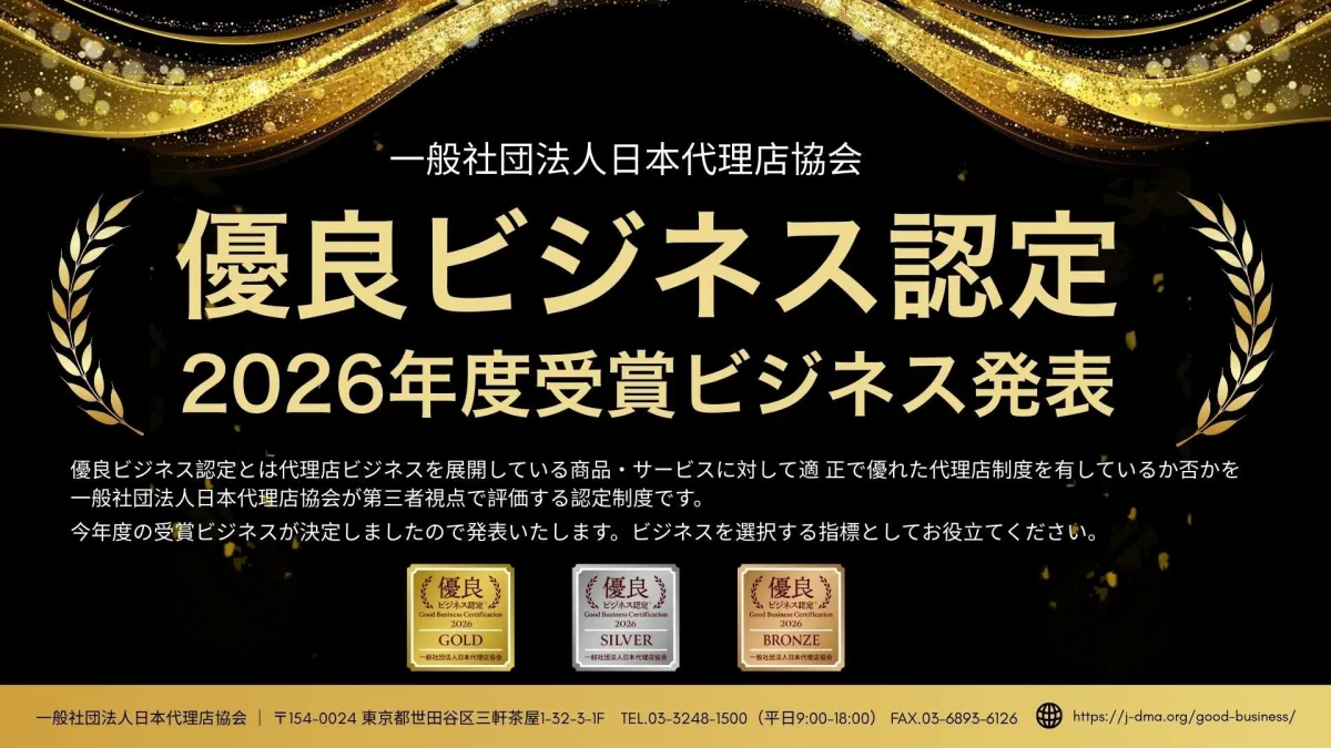 優良ビジネス認定は、日本代理店協会が実施する、信頼性のあるビジネスの評価・認定制度です。この認定は、代理店ビジネスを選ぶ際に、企業が抱える不安を解消し、安心して選択肢を検討できる環境を提供することを目的としています。