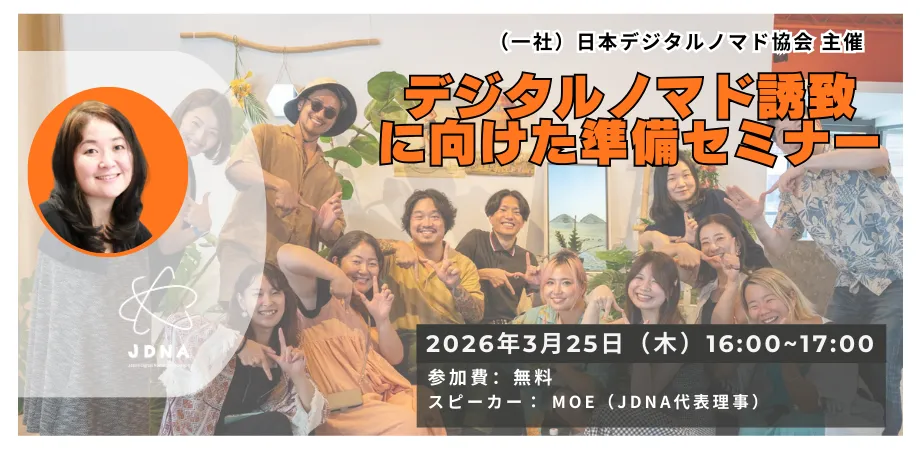 一般社団法人 日本デジタルノマド協会(JDNA)が、2026年3月25日に「デジタルノマド誘致に向けた準備セミナー」を無料で開催します。このイベントは、デジタルノマドの受け入れ環境を整えるための第一歩として、自治体や地域の事業者に向けた重要な情報を提供します。