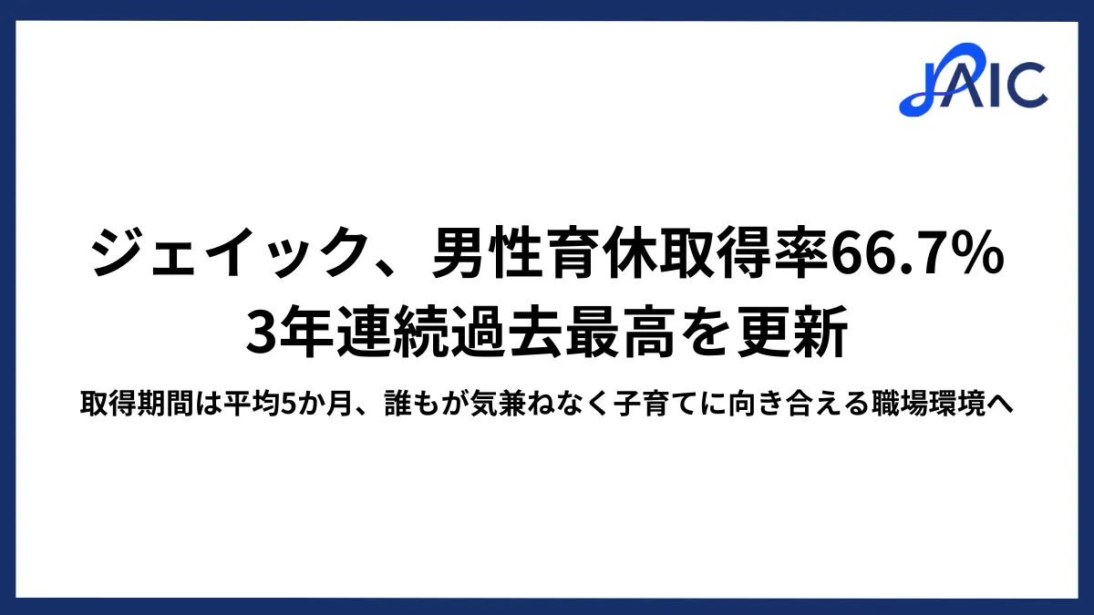 株式会社ジェイックが発表した男性育児休業取得率が66.7%に達し、過去最高記録を更新した。これは厚生労働省の全国平均30.1%を大きく上回る数字であり、3年連続での成長を示している。