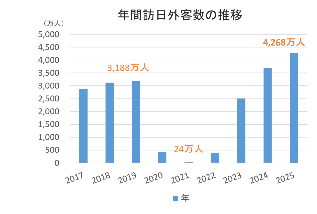 近年、日本のインバウンド需要が急増しています。特に2025年には、訪日外客数が4,268万人に達し、前年比15.8%の増加を見込み、過去最高を更新することが確実視されています。この数値は、2024年実績の3,687万人を約580万人上回るもので、日本全体が観光需要の強い成長局面に入ったことを示しています。