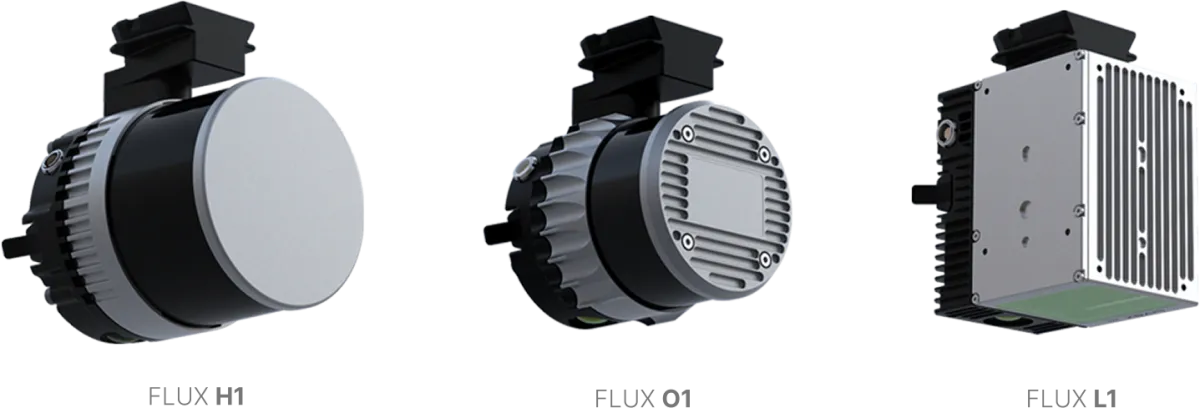 - - Flux H1: エントリーモデルで、非反復スキャンを搭載。レーザーチャンネル数は32、精度は±3cmで、1秒あたり1,920,000ポイントのデータ取得が可能。重量は約690g。
