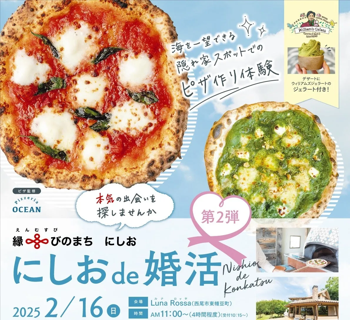 愛知県西尾市で、地域の魅力を活かした婚活イベント「にしおde 婚活」の第2弾が、2025年2月16日(日)に開催されます。今回のテーマは「海を一望できる隠れ家スポットでのピザ作り体験」。第1弾の「チョコレートドリンク作り&クルージング」の成功に続き、さらなる素敵な出会いを求める方々をお待ちしております。