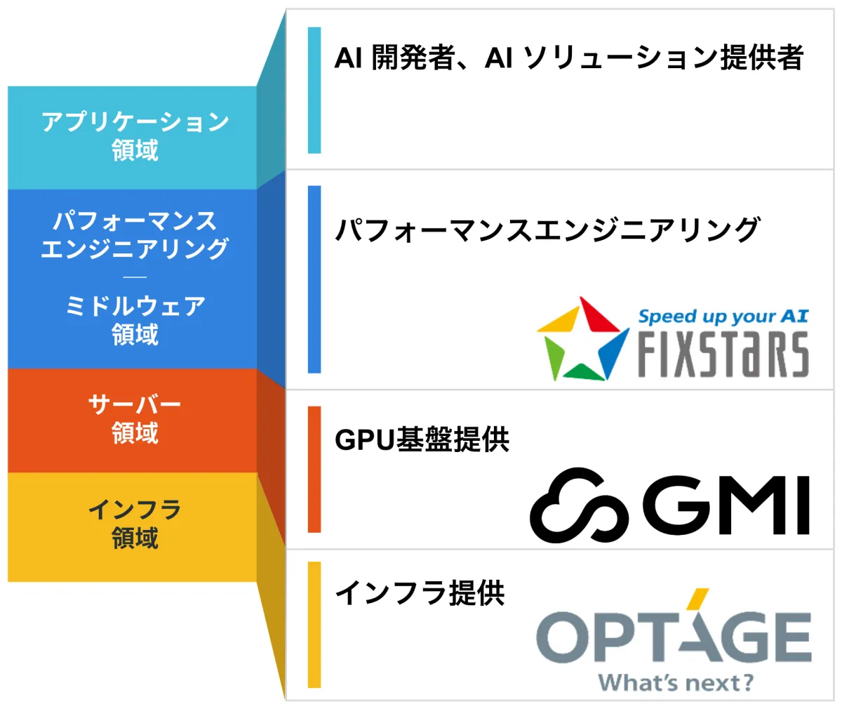 フィックスターズは、計算資源を最大限に引き出すためのソフトウェア最適化技術を駆使し、幅広い分野で次世代AI技術の進展をリードする姿勢を堅持しています。オプテージは固有の光ファイバーネットワークを基にし、法人向けと個人向けに多様な通信ネットワークサービスを提供。GMI CloudはAI導入の簡素化を目指し、企業にとって使いやすくスケーラブルなソリューションを提供しています。