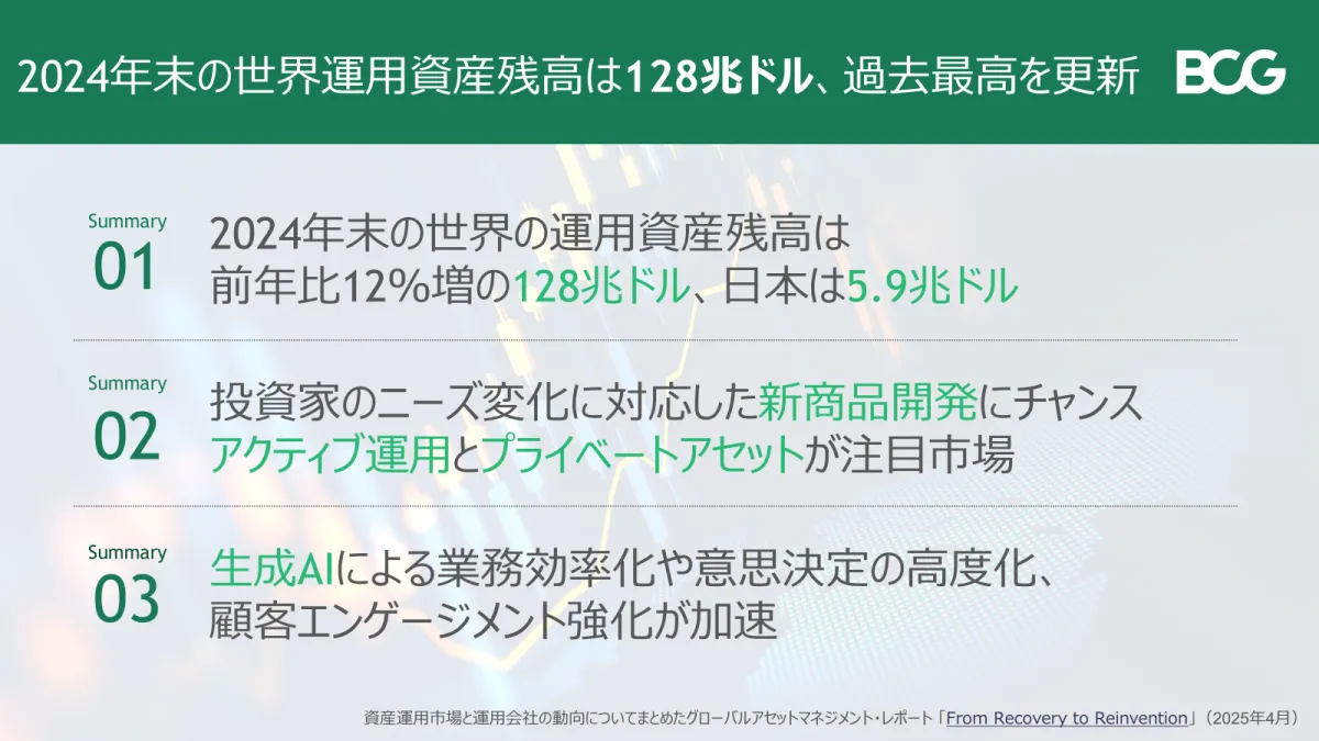 ボストン コンサルティング グループ(BCG)は、2024年末のグローバルアセットマネジメントレポートを発表しました。このレポートには、運用資産市場の現状と今後の展望が詳述されています。2024年末の世界全体の運用資産残高は128兆ドルに達し、2023年の115兆ドルから12%の増加を示す見込みです。この成長は、過去最高の数値とされ、多くの国々において運用資産が増加する要因となっています。