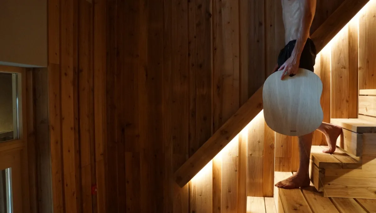 アーティストリーの木工サウナー、大西氏は、サウナの熱温度と天然素材の組合せが絶妙な相性を生むと考え、日本のサウナ文化でも受け入れられると確信しました。木製サウナマットは、その優れた耐水性を活かすため、合板素材を使用しており、表面は丁寧に研磨されています。その結果、毛羽立つことがなく、安心して使用できる環境が整えられています。