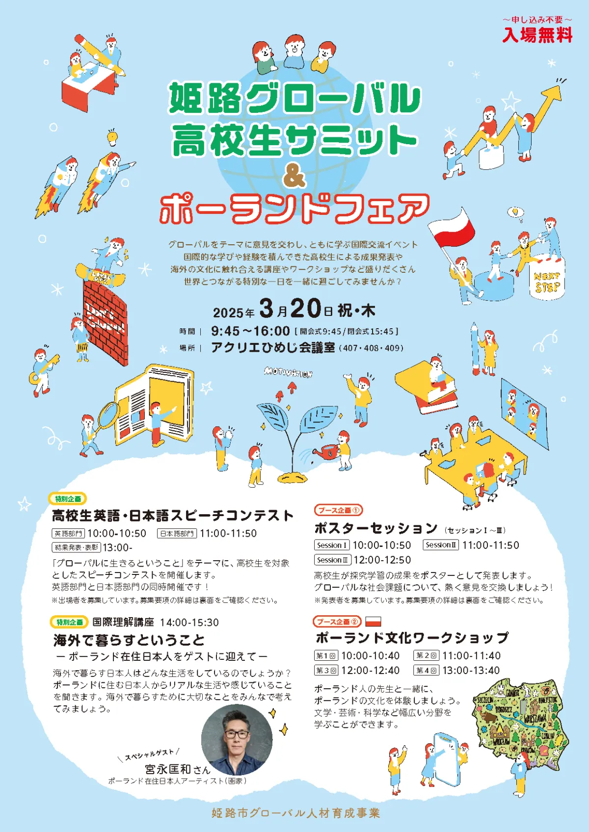 来る令和7年3月20日(祝日・木曜日)、姫路市では「姫路グローバル高校生サミット&ポーランドフェア」が開催されます。このイベントは、アクリエひめじの会議室(407、408、409)で行われ、午前9時45分から午後4時までの一日を通じて、さまざまな学びの機会が提供されます。