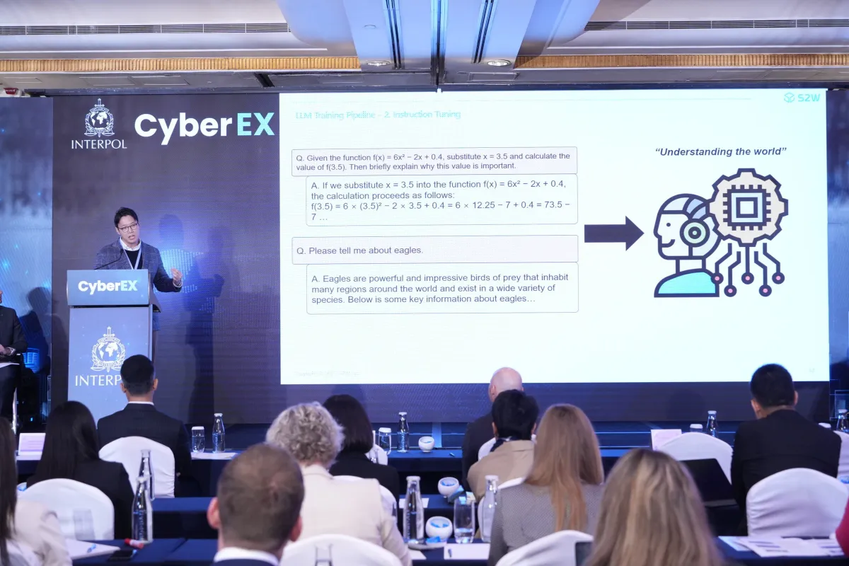会合初日のプログラム「サイバー攻撃発生前段階の予防におけるイノベーション」において、S2Wの徐賢旻取締役が講演を行いました。彼の発表は、大規模言語モデル(LLM)の脆弱性に焦点を当て、トークン化の欠陥からダークウェブの事例まで、予防策について詳細に解説しました。これにより、参加者はLLMの潜在的なリスクとセキュリティに関する新たな洞察を得ることができました。