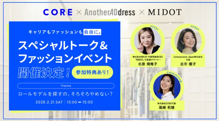 2026年2月21日、東京・日本橋の「AnotherADdress TOKYO」で、ファッションイベントが開催されます。このイベントは、ファッションサブスクリプションサービス「AnotherADdress」、ライフスタイルブランド「MIDOT」、そしてCORE株式会社の3社による共同の取り組みです。
