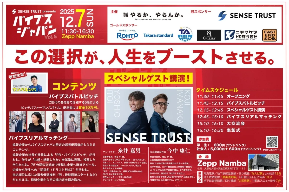 2025年12月7日、Zepp Nambaにて、関西でのキャリアを志す学生に向けた「バイブスジャパンVol.5」が開催されます。このイベントは、2500人以上の学生たちが参加した実績を誇る、キャリアに関する大型イベントです。運営は奈良県橿原市に本社を置く株式会社やるかやらんかで、代表の西奈槻氏が、自らの経験をもとに若者が抱えるキャリアの不安を解消するべく取り組んできた企画です。