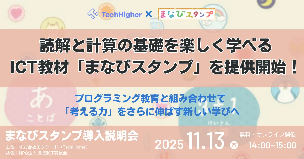 10代向けのデジタル人材育成サービス『TechHigher』を運営する株式会社エクシードが、NPO法人教室ICT実践会が開発した学習ドリル教材『まなびスタンプ』を2025年11月より提供することを発表しました。この新しいICT教材は、加盟教室を通じてプログラミング教育にとって必要な基礎学力、すなわち読解力と計算力を楽しく学ぶ機会を提供します。
