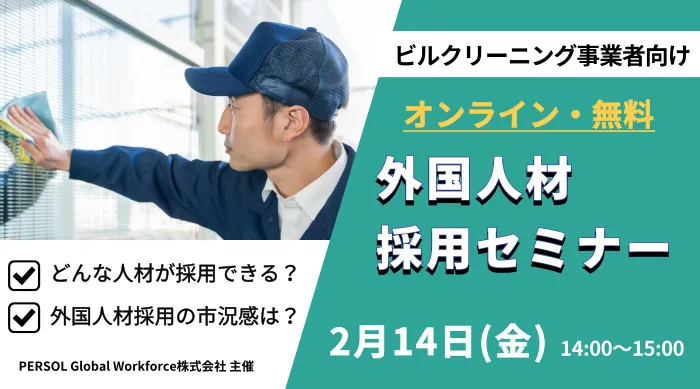 来たる2025年2月14日(金)、PERSOL Global Workforce株式会社が主催するビルクリーニング分野に特化した外国人材採用セミナーが開催されます。今回のオンラインセミナーは、外国人材の採用に関心を持つ企業に向けて行われるもので、特にビルクリーニング業界での採用の流れやポイントを詳しく解説します。