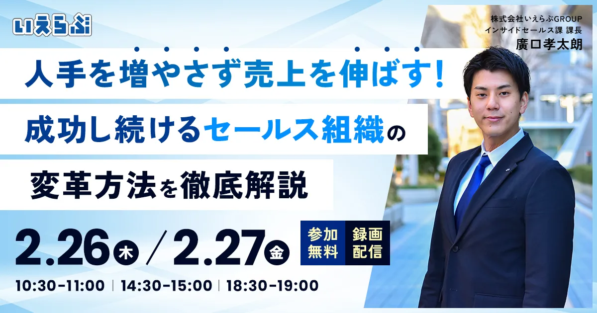 株式会社いえらぶGROUPは、2026年2月26日と27日の2日間にわたり、「人手を増やさず売上を伸ばす!成功し続けるセールス組織の変革方法」についてのセミナーを行います。このオンライン形式のセミナーは、録画配信のライブ形式で、参加者が実践的な知識を身につける絶好の機会です。
