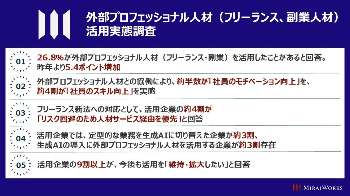 今調査は、外部プロフェッショナル人材の活用が進む中での企業の姿勢や取り組みを明らかにしました。リスク管理や情報開放、業務の細分化といった課題をクリアしながら、柔軟かつ高効率なビジネス運営を模索する企業の姿勢が見て取れます。今後も、フリーランスを含む外部人材の活用が、企業の成長戦略において重要な役割を果たしていくことでしょう。