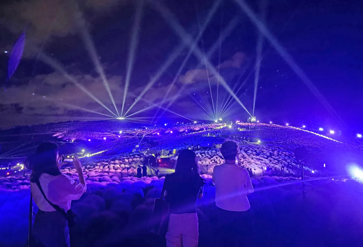 みはらしの丘には358台のLEDライトと34台のムービングライトが設置され、昨年に比べて23台増加しました。それにより、約4万本のコキアが輝きを放ち、迫力ある景色を提供しています。