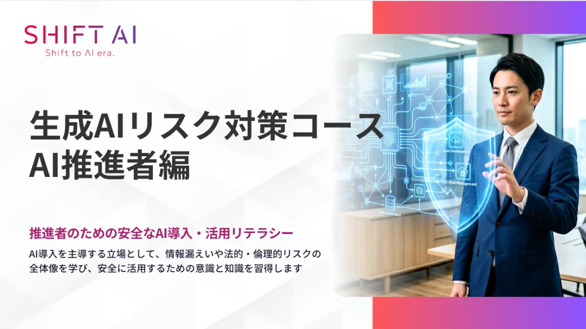 株式会社SHIFT AIが2026年3月18日より、法人向けのリスキリングサービス『SHIFT AI for Biz』において、新たに『生成AIリスク対策コース AI推進者編』の提供を開始します。このコースは、企業におけるAIの導入や活用を進める担当者を対象に設計されており、迅速に変化するAIの導入環境に必要な知識やスキルを体系的に学ぶことができます。