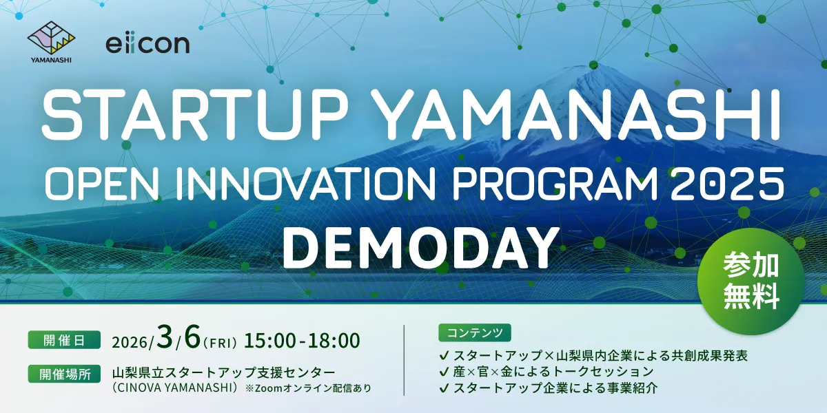 2026年3月6日、山梨県立スタートアップ支援センターCINOVA YAMANASHIにおいて、山梨県と株式会社eiiconが共同で主催するイベント『STARTUP YAMANASHI OPEN INNOVATION PROGRAM 2025 DEMODAY』が開催されます。このイベントは、全国のスタートアップと連携しながら県内企業が取り組んできた4つの共創プロジェクトの成果を発表する場となります。