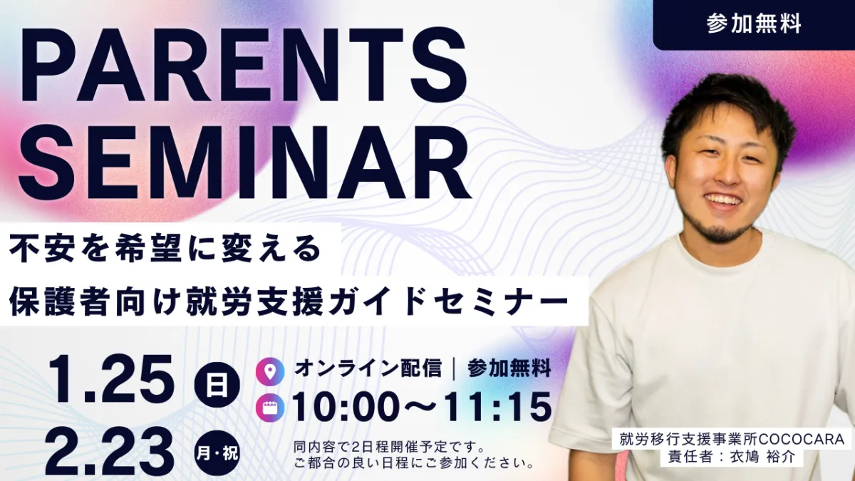 2026年1月25日(日)および2月23日(月・祝)、東京都豊島区の就労移行支援事業所COCOCARAが、保護者向けに「就労支援ガイドセミナー」を開催します。このセミナーは、発達障がいや精神的特性を抱えるお子様の将来を考え、保護者が抱える不安を軽減することを目的としています。