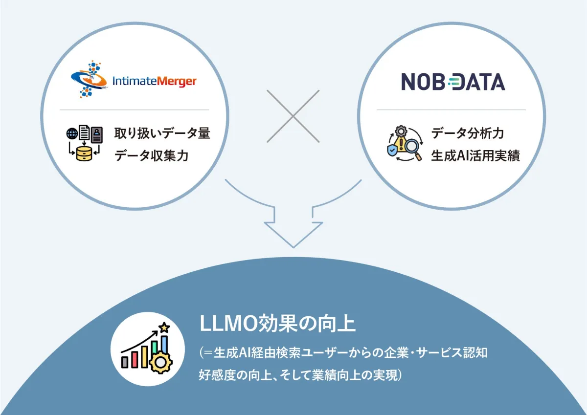 NOB DATAは生成AIを用いたデータ利活用に強みを持ち、インティメート・マージャーはデータ・マネジメント・プラットフォーム(DMP)の分野で豊富なデータと技術を有しています。この両者の強みを統合することで、現場に即したLLMOソリューションを提供できるとされています。