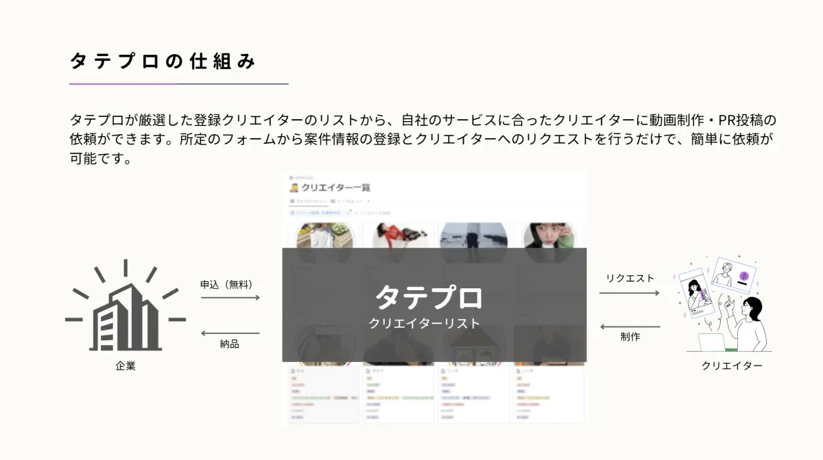 TATE-PROは、特にTikTokやInstagramで活躍するクリエイターと企業をつなぐサービスです。企業側は、自社製品やサービスに合ったクリエイターを選び、そのクリエイターに動画制作を依頼することができます。今回のプレミアムウォーターにおいては、複数のマイクロインフルエンサーを起用し、インフルエンサー視点のリアルな動画コンテンツを制作しました。これによって、企業のリソースを抑えつつ効果的なPRが実現しました。