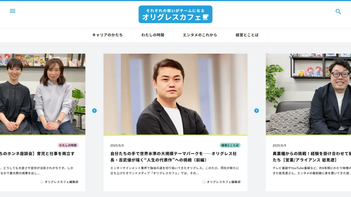 「オリグレスカフェ」は今後も定期的に新しいコンテンツを追加していく予定です。エンタメ業界で働く「人」の魅力と可能性に触れられるこの場所で、多くの方々との新しい出会いを楽しみにしています。ぜひ、これからの展開にご期待ください。