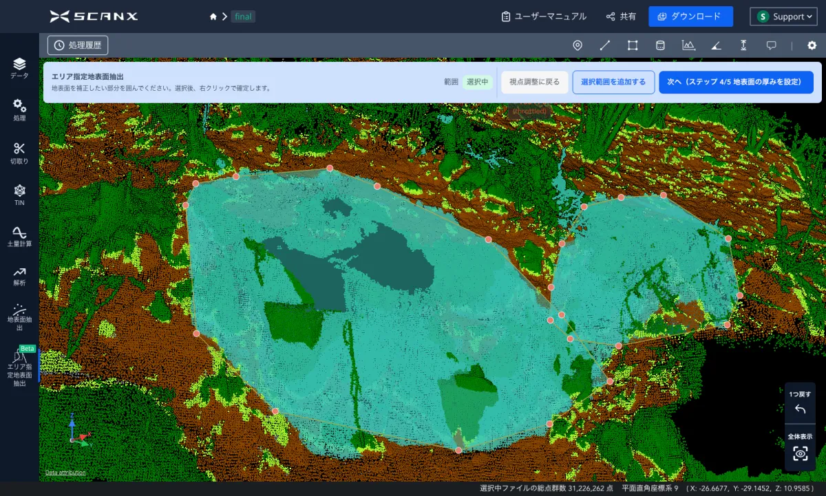 しかし、新機能の『エリア指定地表面抽出機能』は、必要なエリアだけを選択し、その部分に対してのみ再分類処理を行うことができます。この機能により、以下のような利点がもたらされます: