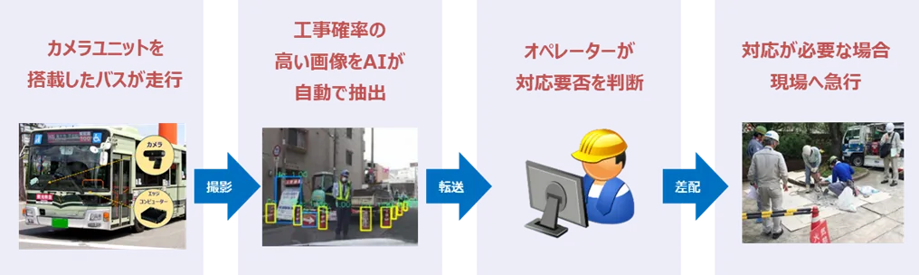 AIカメラが路線バスに搭載され、走行中に周囲の写真を撮影します。その中からAIが選別した画像を基に、工事の可能性を判断し、オペレーターが事務所で確認します。このシステムにより、迅速に連絡のない他工事を発見でき、ガス管の安全を維持します。