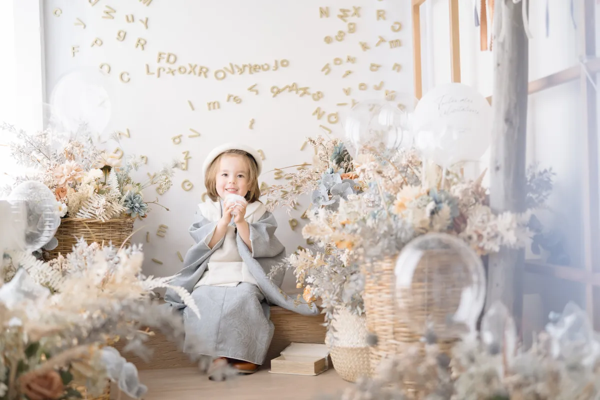 さまざまな和洋の衣装が揃っており、国内外のアンティーク衣装も取り入れています。特に、七五三用の和装が人気で、兄弟姉妹全員のトータルコーディネートも可能です。また、撮影を行う前後1か月の期間にお宮参りの産着レンタルサービスも用意されています。