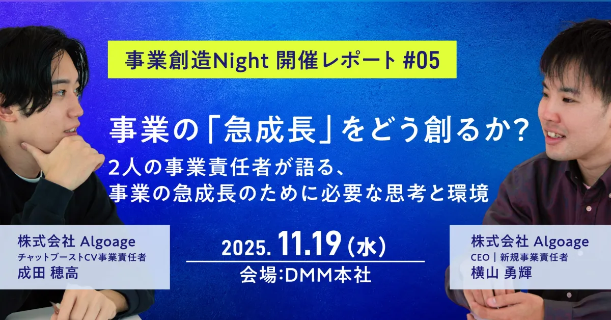 株式会社Algoageが開催した「事業創造Night」第5回目のイベントでは、急成長を遂げた企業としての思考や環境について、実際にその中心で活動する責任者が語りました。イベント名は「事業の急成長をどう創るか?」で、経営トップや重要な事業責任者がどのように事業を推進しているのかに迫ります。