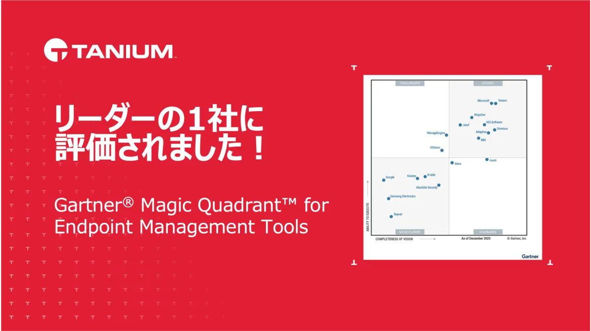 タニウムは、AIを駆使した自律型ITのリーダーとして、2026年の「Gartner® Magic Quadrant™ for Endpoint Management Tools」にてリーダーの一社として認定されました。この評価は、タニウムのリアルタイムでの可視性およびグローバルな拡張性を備えたエンドポイント管理機能によるものです。特に、AIを活用した自律型エンドポイント管理(AEM)は、企業の複雑なニーズを満たすための効果的なソリューションを提供しています。