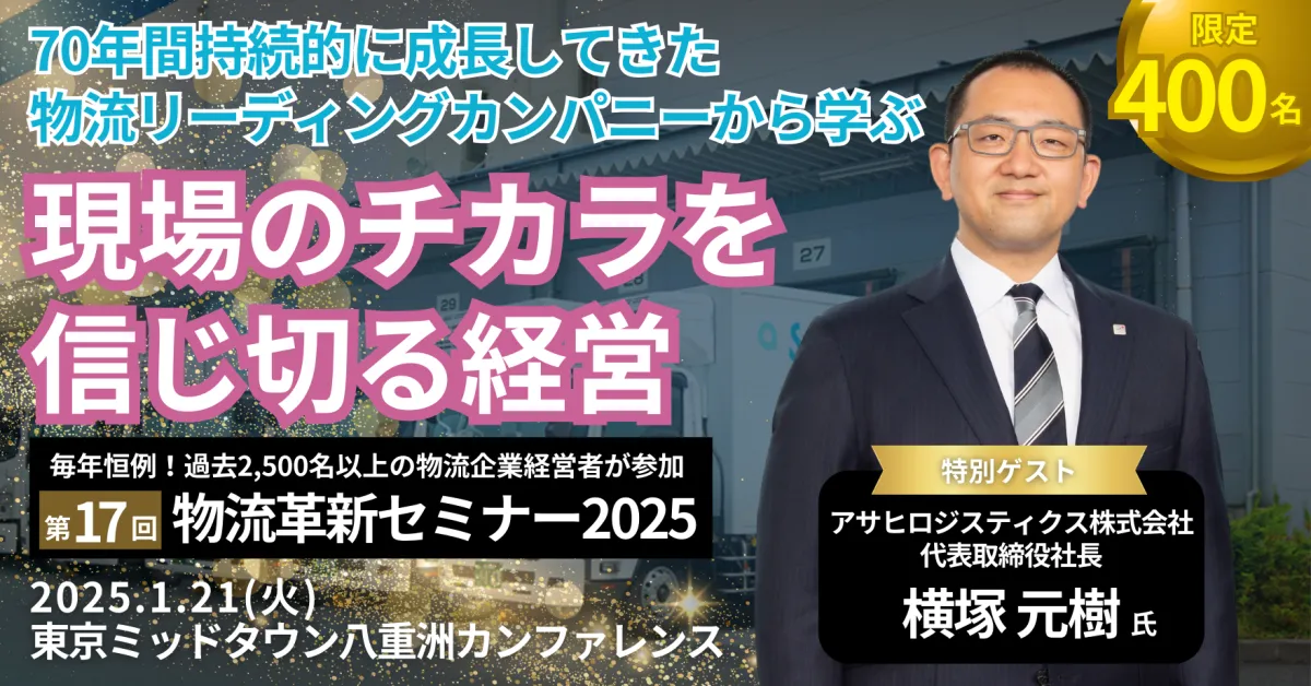 物流業界に携わる皆様に朗報です。2025年1月21日(火)、東京ミッドタウン八重洲にて「第17回 物流革新セミナー」が開催されます。本セミナーは、運輸・物流業の経営者や幹部を対象にした特別イベントであり、毎年多くの参加者で賑わっています。