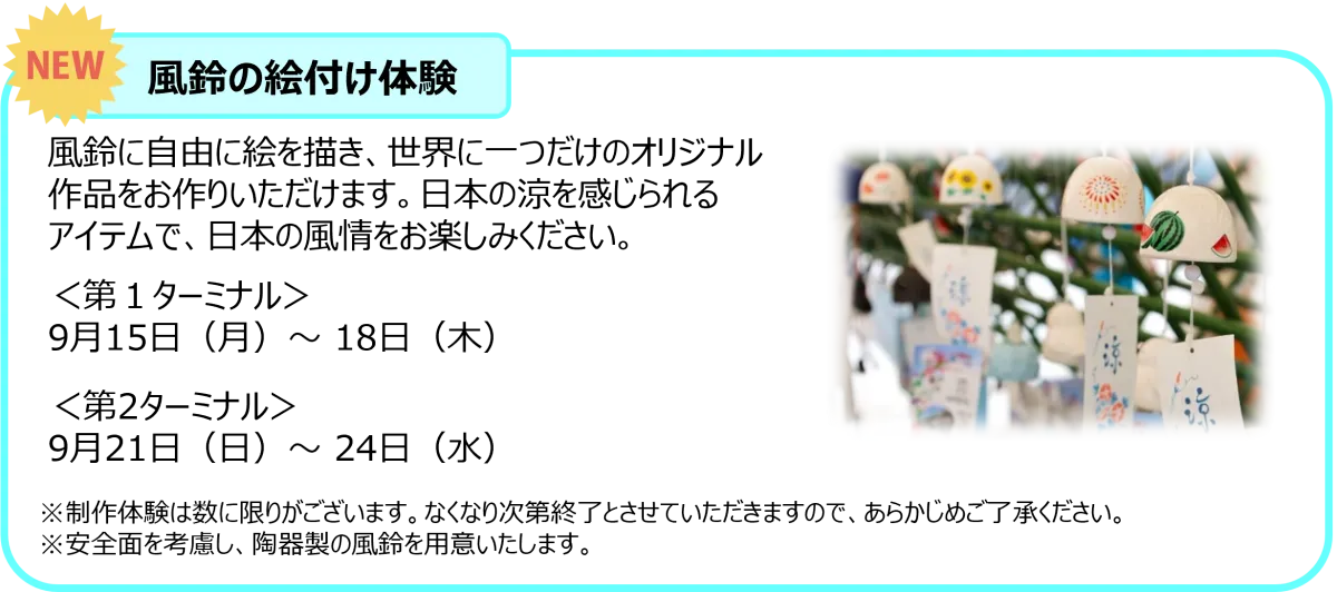 成田空港は、日本を訪れる海外からのお客様に向けた特別な文化体験を提供しています。9月の日本文化紹介イベントでは、暑さが残るこの時期にぴったりな冷涼感を感じられる風鈴の絵付け体験が実施されます。このイベントを通じて、日本の伝統的な文化に触れ、訪れる人々に「また来たい」と思わせる瞬間を提供します。