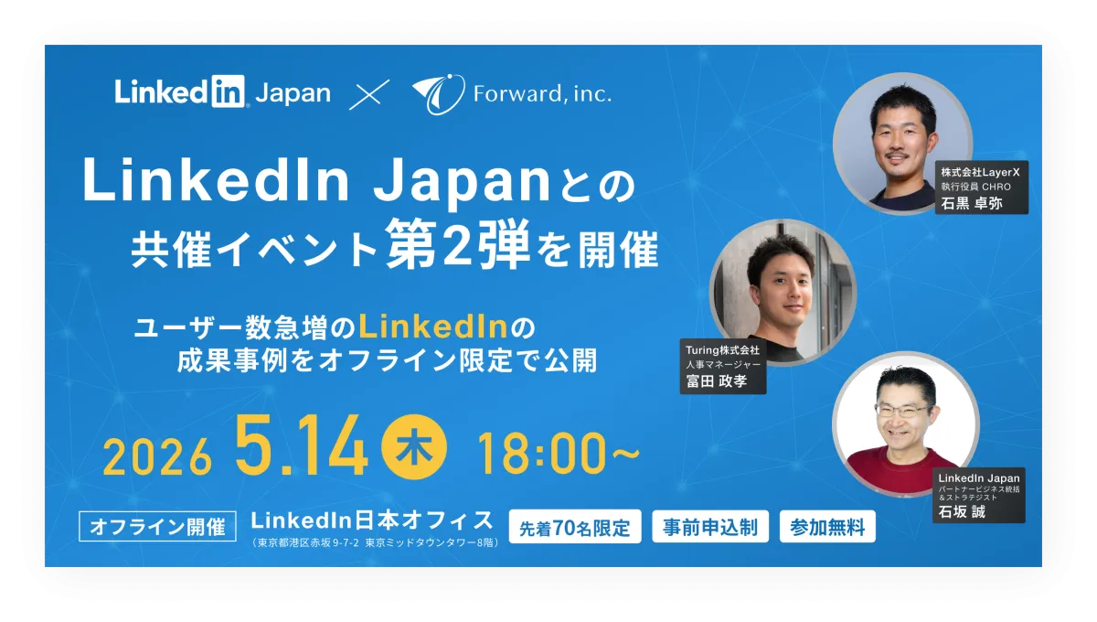株式会社フォワードは、LinkedIn Japanと共同で、2026年5月14日(木)に東京都港区にあるLinkedIn日本オフィスにて人事・採用担当者向けにオフラインイベントを開催します。このイベントは、ビジネスSNSの活用が進む中、特に採用活動に役立つ情報を提供することを目的としています。