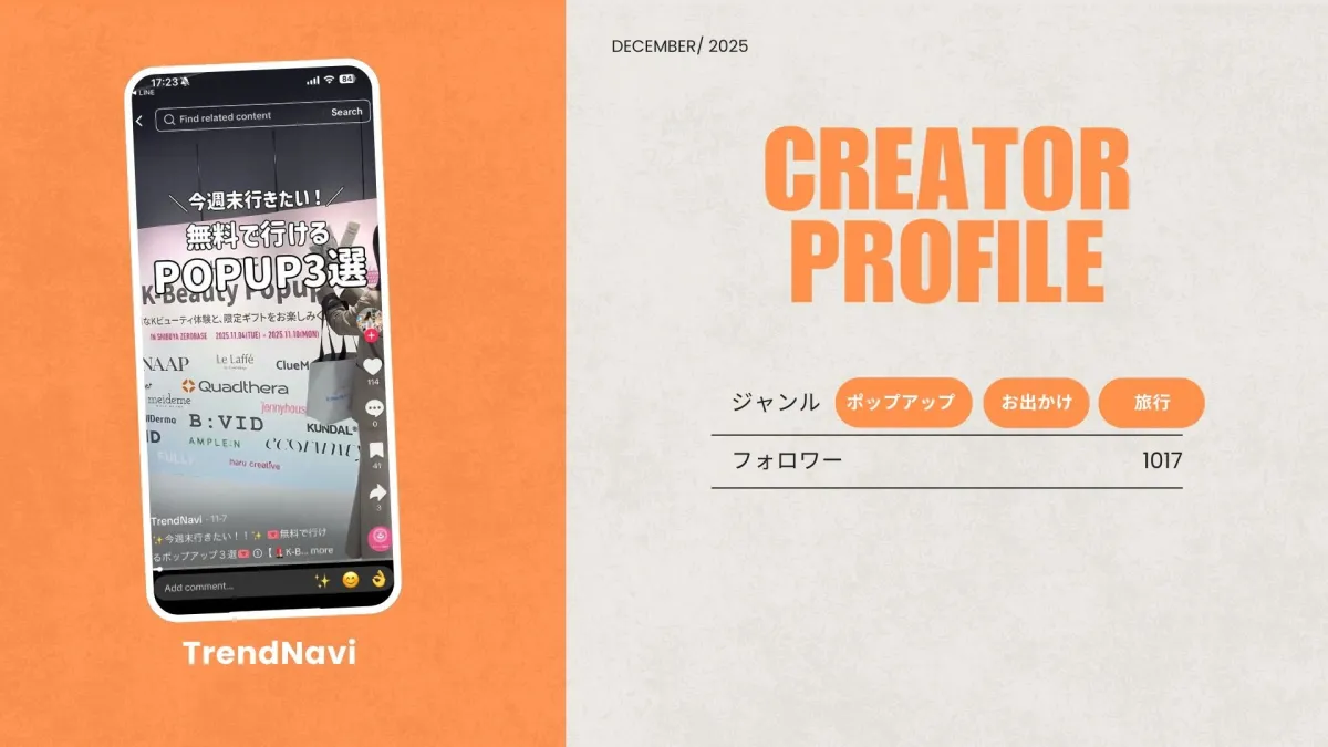 具体的には、ポップアップ・おでかけ・旅行といったジャンルに特化しており、ユーザーの興味を引くコンテンツづくりが得意です。このようなジャンルでの活動は、SNS上でのイベント認知や集客に大きな効果をもたらすでしょう。