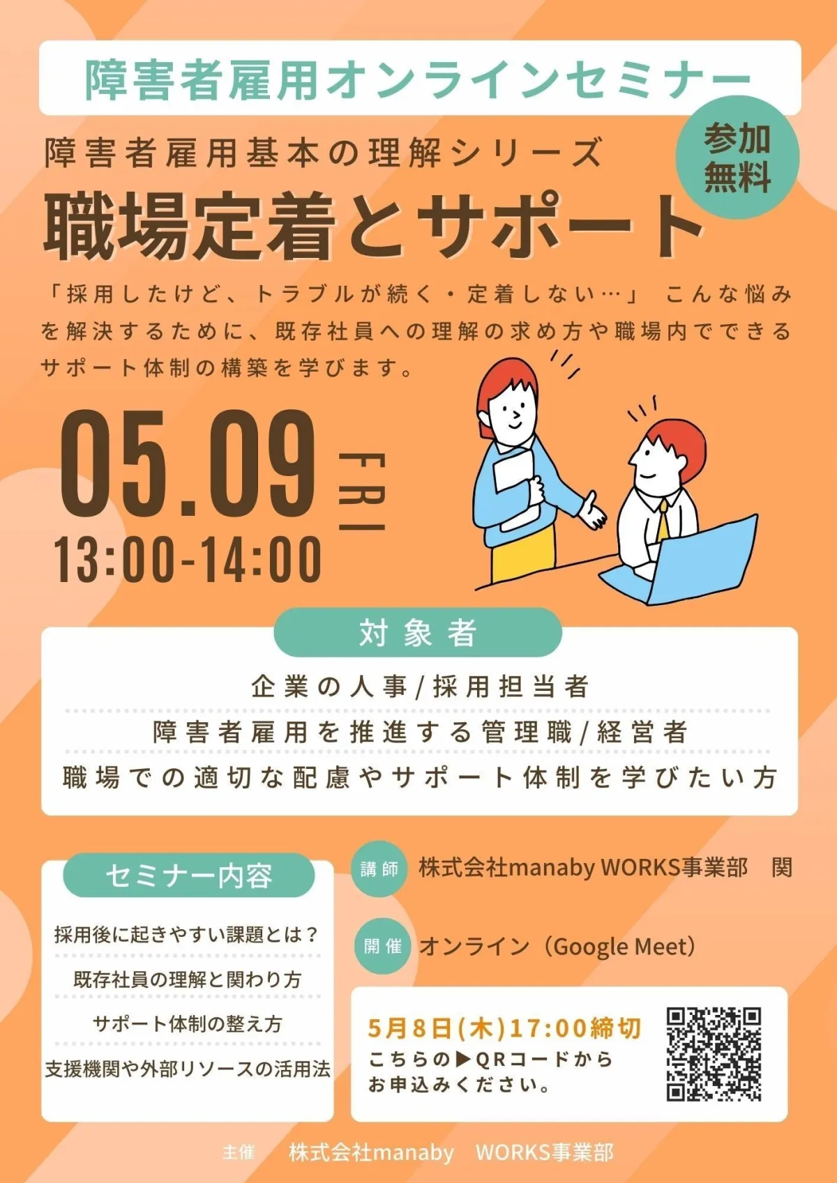 株式会社manabyが主催するオンラインセミナー「障害者雇用 基本の理解シリーズ 職場定着とサポート」が、2025年5月9日(金)に開催されます。このセミナーでは、障害を持つ方々が職場で安定して働ける環境を整えるための知識や手法を学ぶことができます。