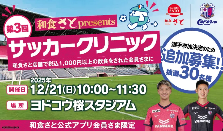 和食さとが運営する「和食さとpresentsサッカークリニック」が、2025年12月21日(日)にヨドコウ桜スタジアムで開催されます。今回のクリニックでは、特別にセレッソ大阪の選手2名が参加することが決定しました。この貴重な機会に、サッカー好きなお子様たちは多くの学びと楽しみを得られることでしょう。